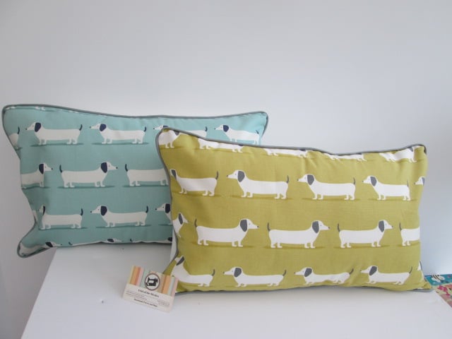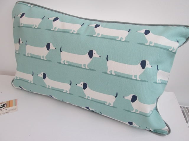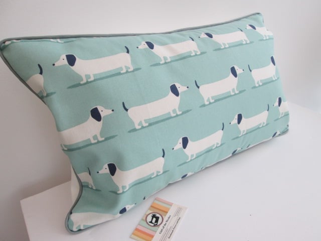Dachsunds fabric cushion with back zip and grey piping.