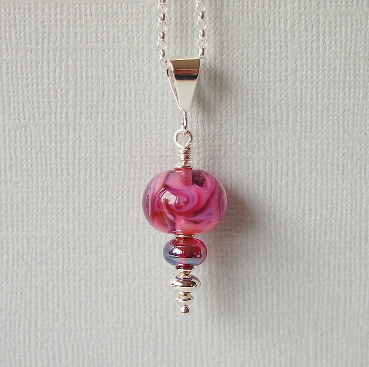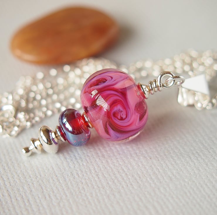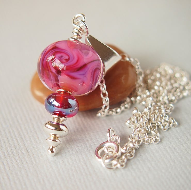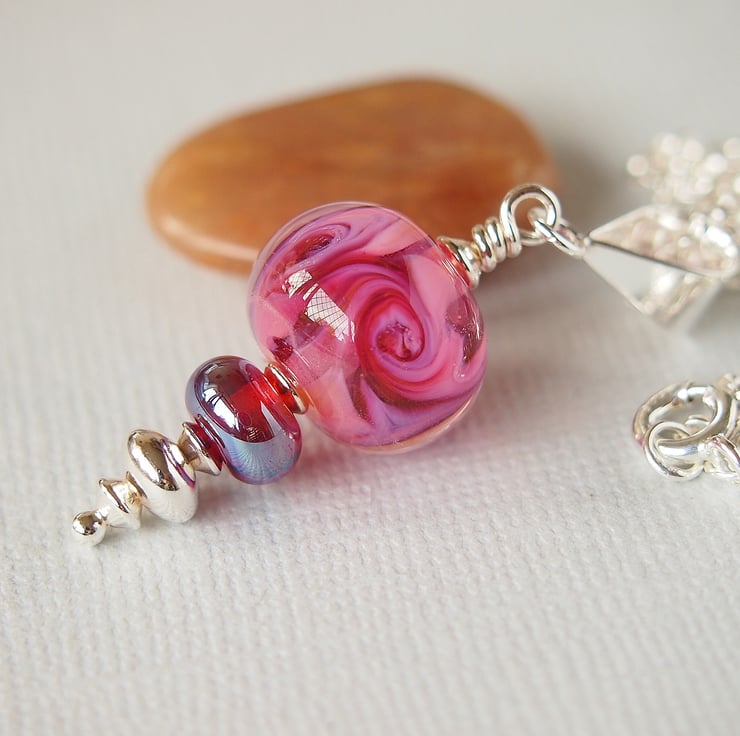 Beautiful pendant featuring a stunning lampwork bead in swirling shades of pink handmade by UK artisan Sue Doran.