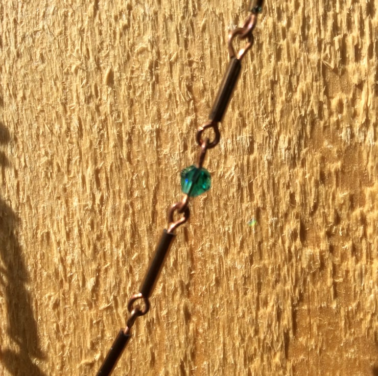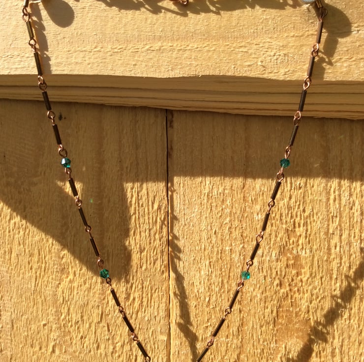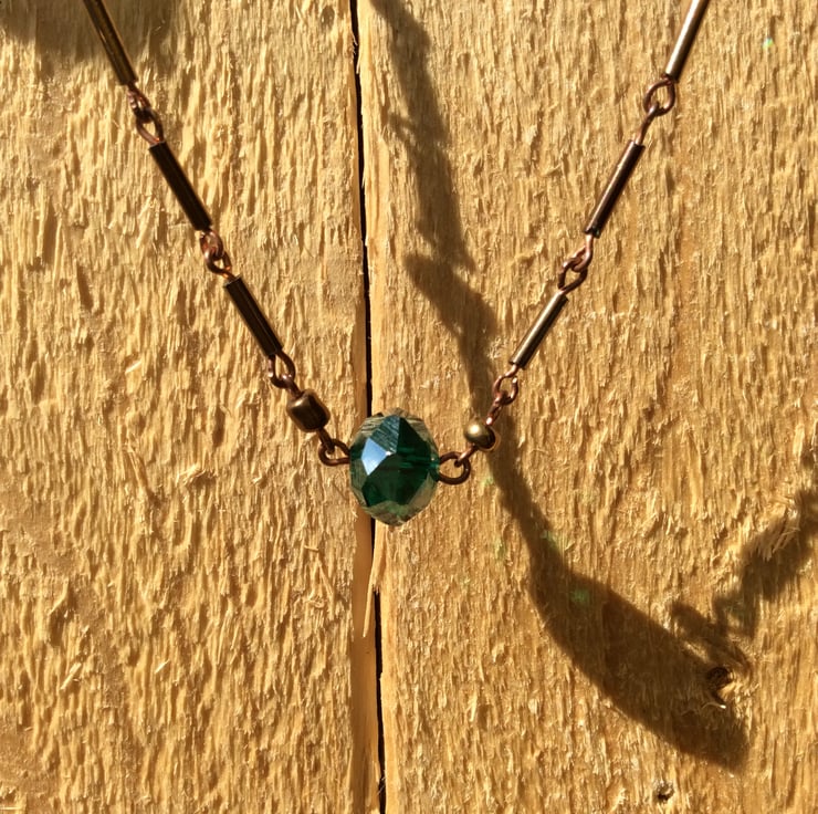 This delicate little necklace has a pretty green fire polished abacus bead focal, with bronze bugle beads, and emerald crystals, hand wrapped with copper wire, with a hand forged clasp.