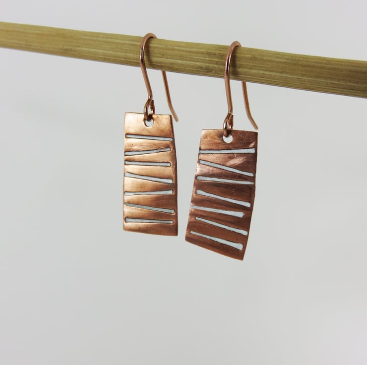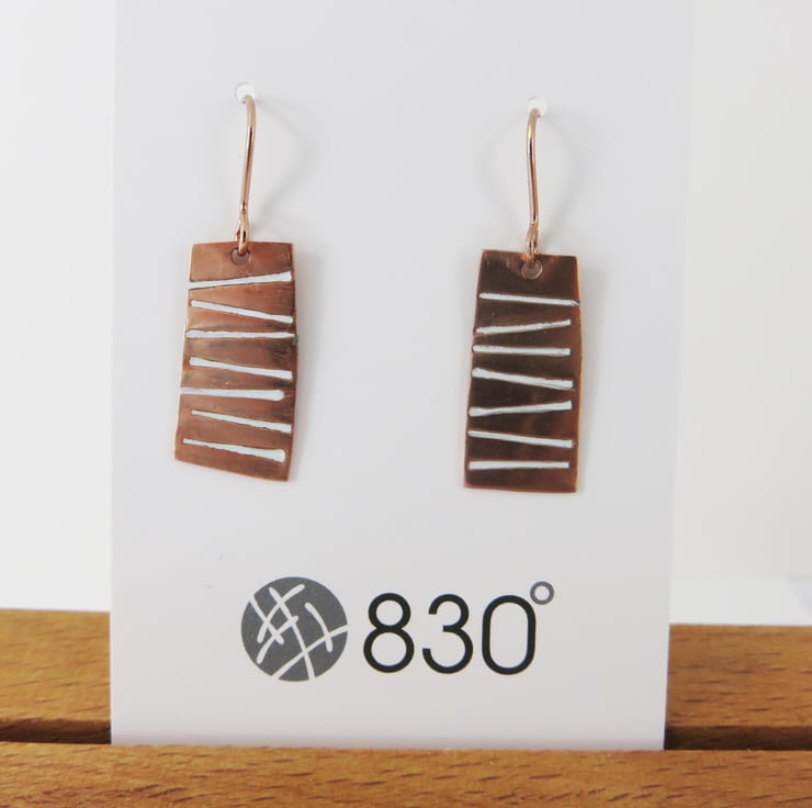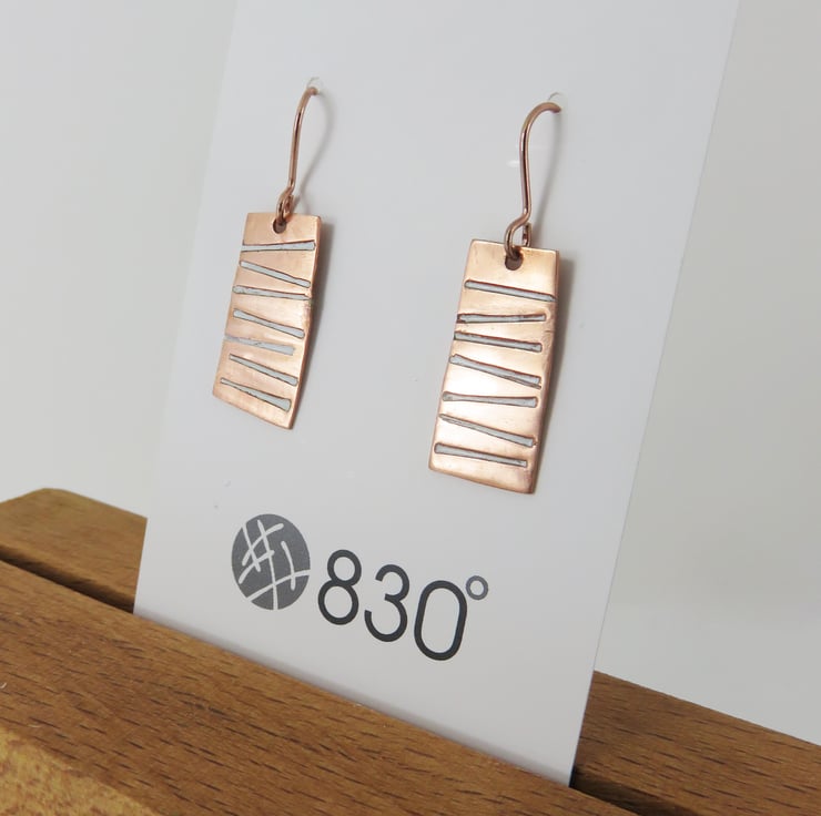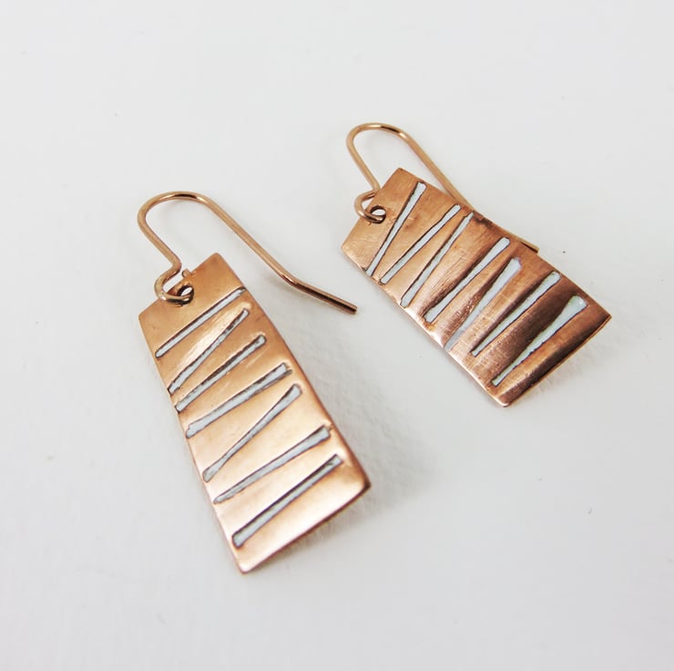 1cm wide by 2.2cm long, hanging 3.5cm from the ear, these dangle earrings are made from hand cut shiny copper. The surface of the copper is textured and enamel applied to the textured surface. The copper then fires at 830 degrees. The copper is hand polished and hung on rose gold plated wires.