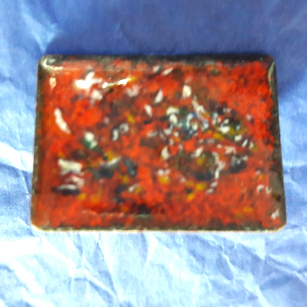 After building up a a base coat of enamel with several layers of clear enamel then a layer of red I have scattered chips of various colours of enamel on the rectangle and fired it again.