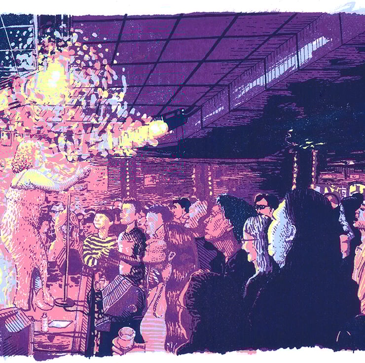 This greeting card is of Martha Reeves performing at the Brudenell Social Club in Leeds. I was there at the gig and from where I stood I had a great view of both the stage and the crowd, and the colours and lighting gave a very atmospheric setting so I thought I’d do a print of it.