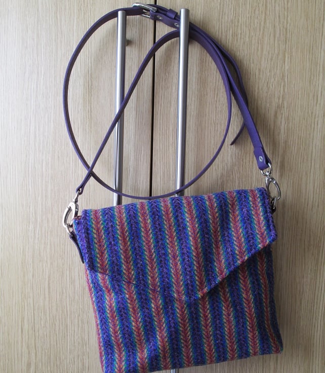 This has got to be one of my all time favourite fabrics - a simply gorgeous rainbow herringbone 'Harris Tweed' handwoven by Shawbost Weavers on the Isle of Harris. I bought a metre of it last year and am making it up into several different items, the first of which is this neat little cross body bag with a lovely purple leather strap.