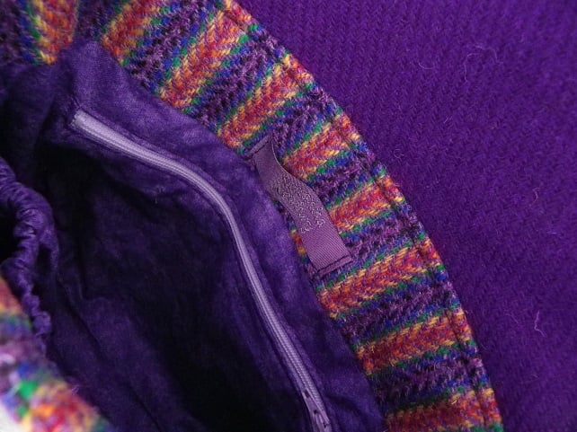 The flap is lined with a coordinating rich purple 'Harris Tweed' and the bag is lined with a faintly marbled purple cotton print. The base has been lightly reinforced with a piece of plastic mesh between the exterior and the lining. See second photo for best colour representation.