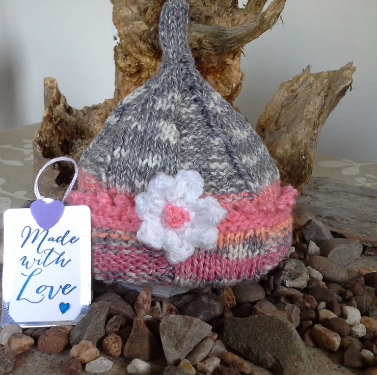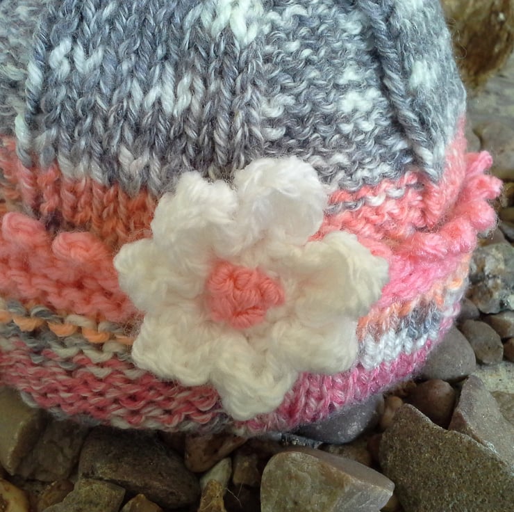 The hat has a slight turn up with a hand crocheted flower and trim to finish off. It would make a perfect token newborn or baby shower gift if the sex is known by the expectant mother.
