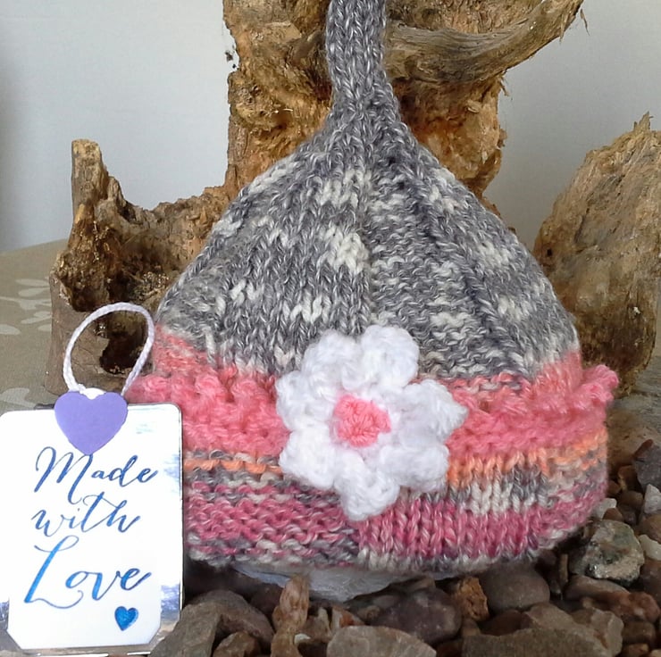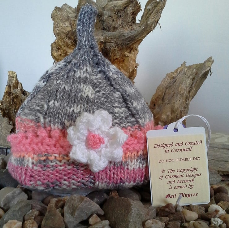 A very super soft baby girl's pixie hat designed and hand crafted by myself.