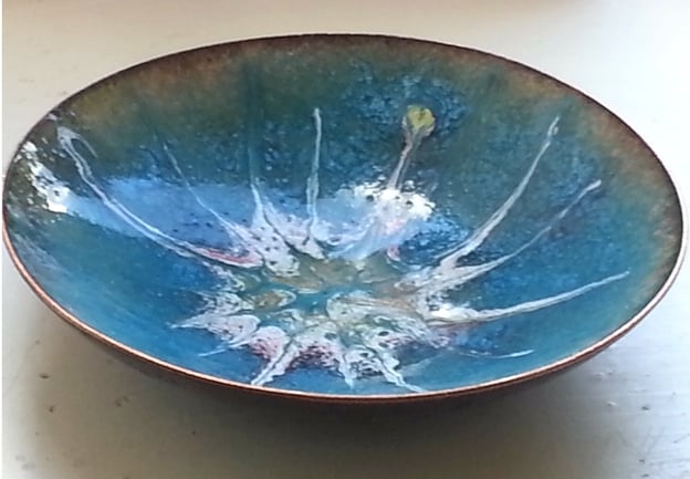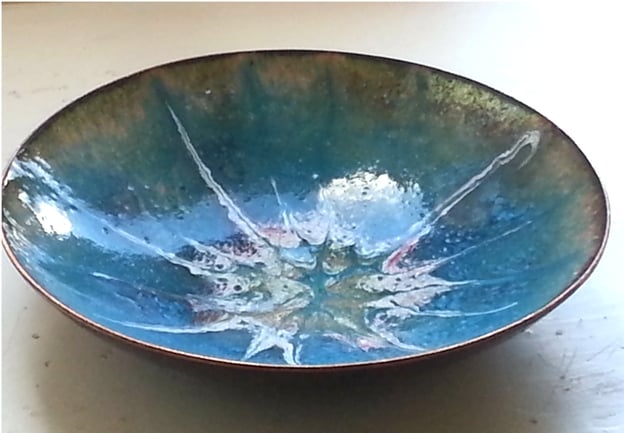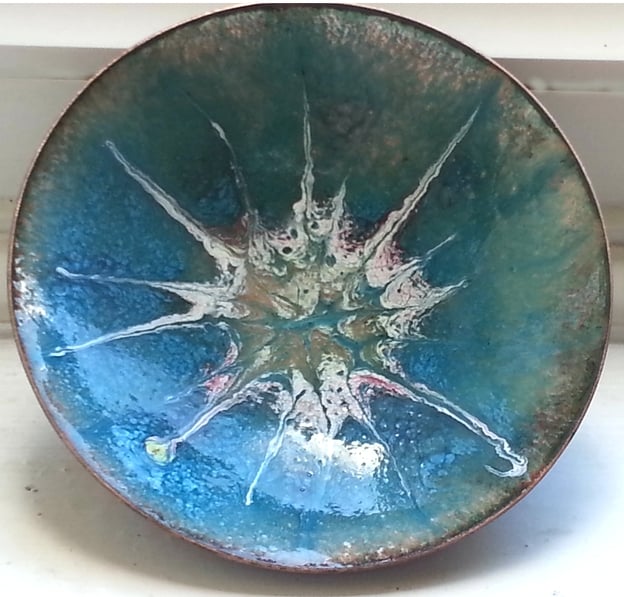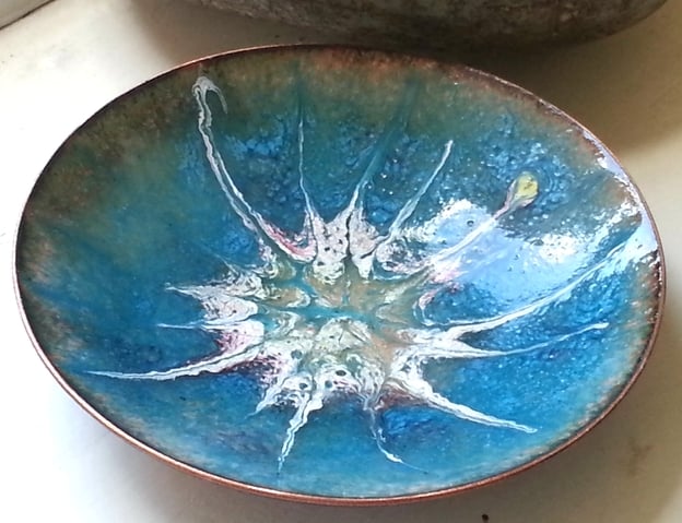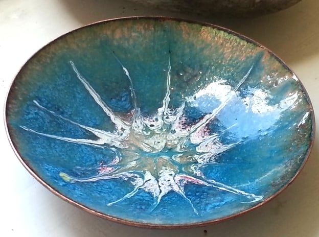 I have built up several layers of clear enamel over which I have then laid a coat of turquoise. This allows the copper base of the dish to show through in tones of golden brown. On the turquoise coat I have put small piles of white and pink enamel and then drawn a steel tip through these while the dish was in the kiln at red hot, making a unique, random, swirling pattern. The enamel is not so molten it will flow easily and as it cools while I have the kiln door open it will set smooth but unevenly. This gives a degree of texture to the piece which adds an effect to the play of light on it.