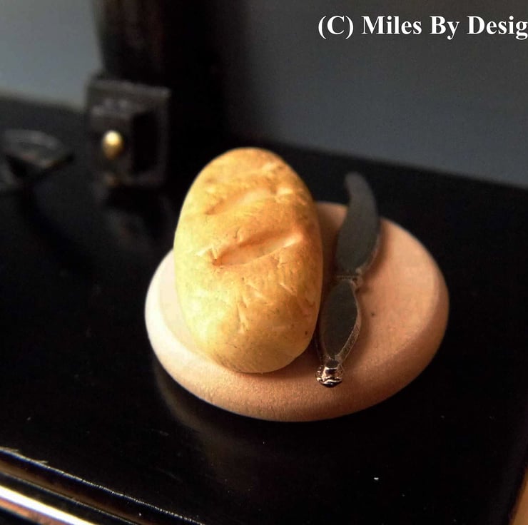 Now your dolls can enjoy the same luxury with this handmade miniature polymer clay loaf and metal knife on wooden board .