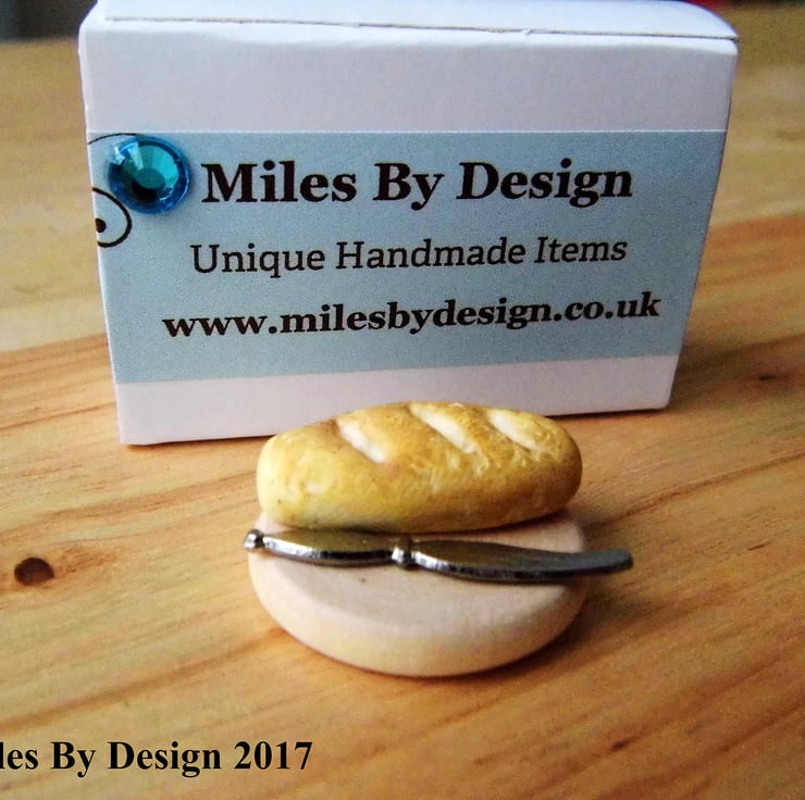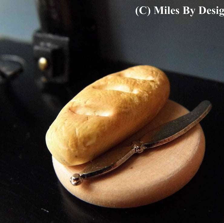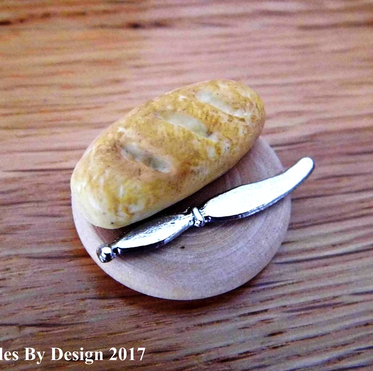 Now your dolls can enjoy the same luxury with this handmade miniature polymer clay loaf and metal knife on wooden board .