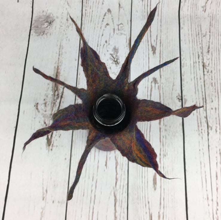 This super wet felted vase has been made using a blend of merino wool in a rainbow of colours. The vase has been felted over a resist making it seamless and shaped during the felting process to accommodate a glass bottle insert. It has several fronds extending from the upper edges giving it a real structural feel. After shaping the felt has been slightly stiffened to give it additional strength and help maintain its shape. The glass bottle insert is included in the listing and allows the vase to be used with freshly cut flowers. Note: the felt vase on its own, without the glass bottle, is not waterproof and may lose some shape if allowed to get wet.