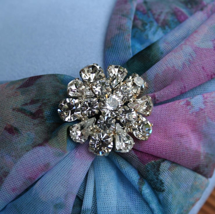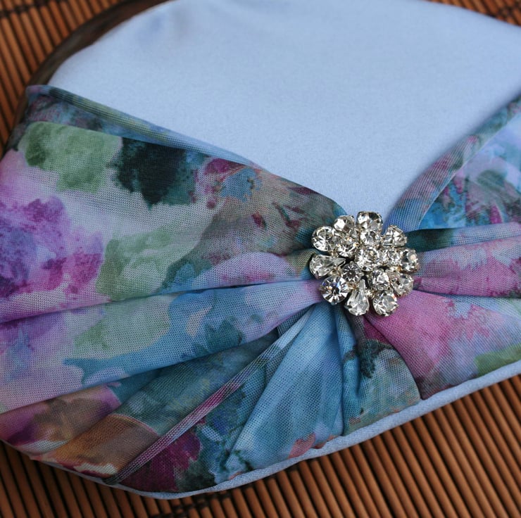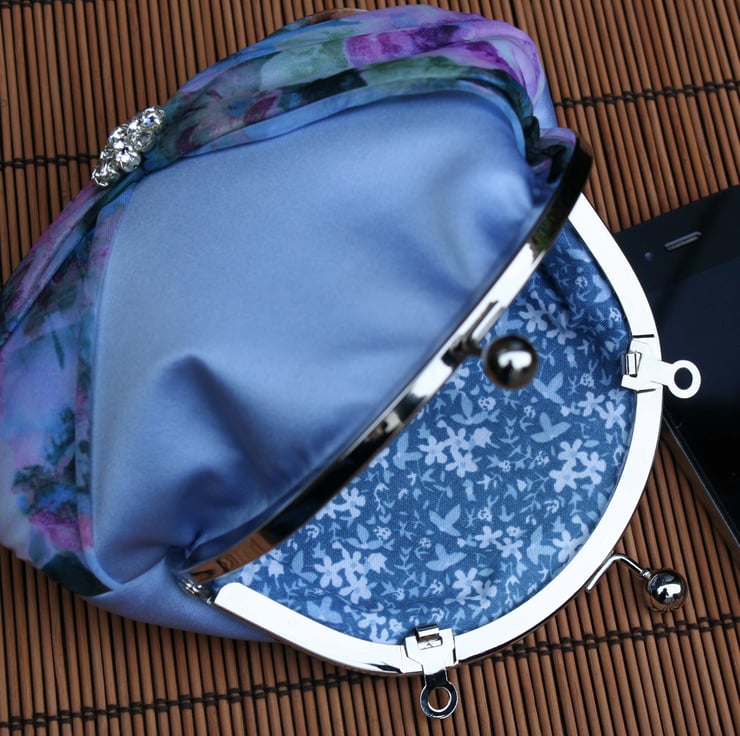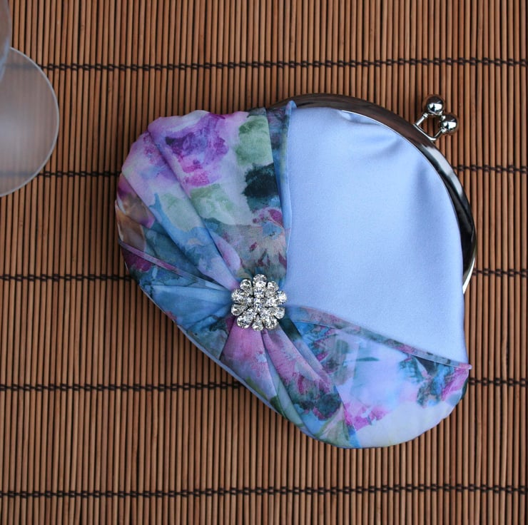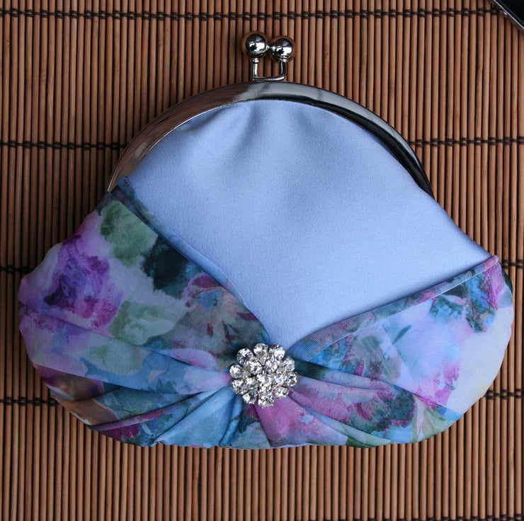 Pale blue satin clutch purse with a fine, floral fabric gathered and draped across the front. The feminine design has been finished off with a diamante button that has lots of diamante stones shaped into a flower. It has been lined with a blue floral cotton fabric. The polished metal frame opens with a kiss lock.