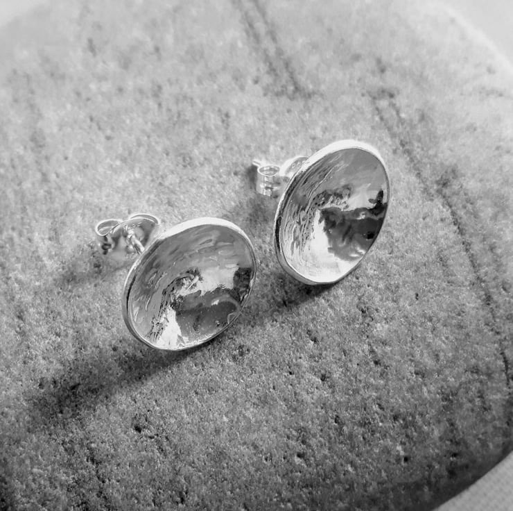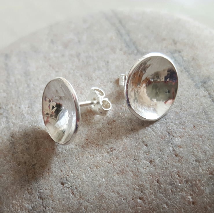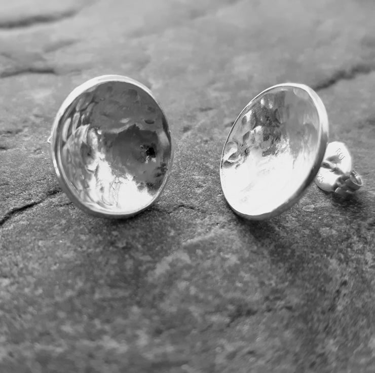 These lovely stud earrings have been cut from sterling silver sheet, hammered to create a dimpled texture and then domed to make a concave form. They are fitted with sterling silver ear posts, securely soldered in place, and butterfly scrolls which are stamped .925 to indicate the purity of sterling. The earrings are 1cm in diameter, light and easy to wear with almost any outfit. They have been tumble polished to a bright shine. These earrings will be packaged in a smart gift box and sent to you by Royal Mail first class post.