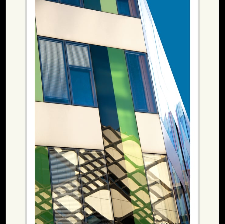A colour photograph unmounted and unframed on good quality glossy paper with archival inkjet inks of one of the Sheffield University Jessop Buildings with the Diamond Building reflected in it. One of my fine art Sheffield Modern Architectural photographs.