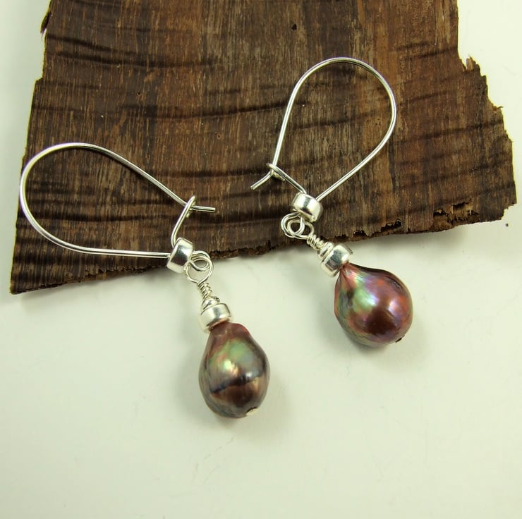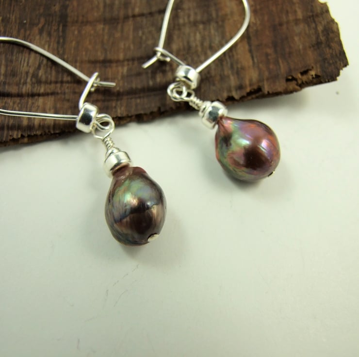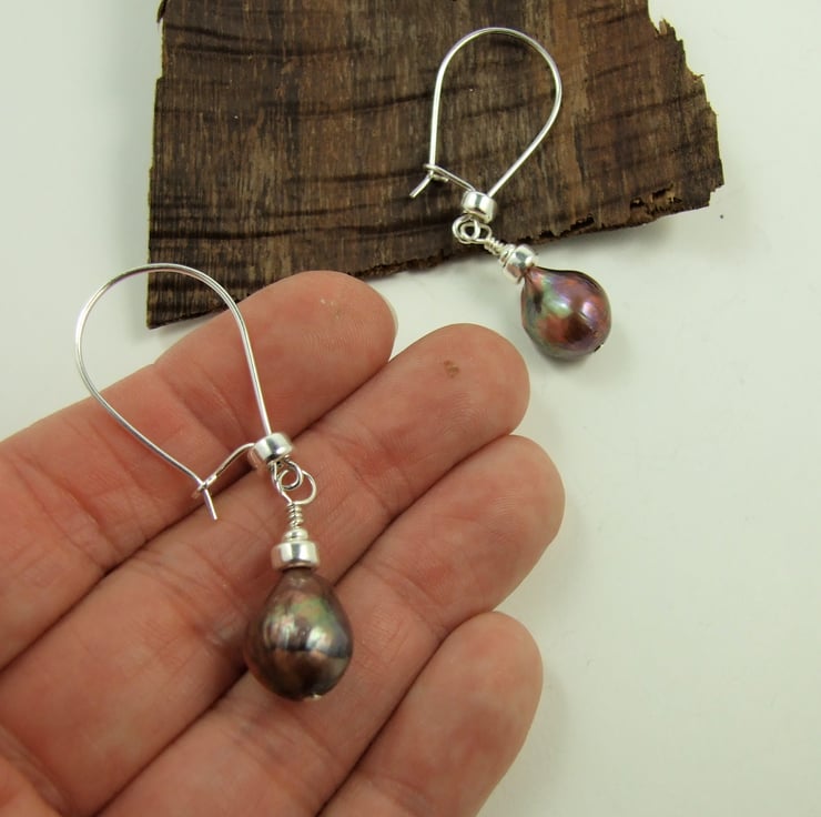 The pearls have a natural teardrop shape and are rounded at the front, with a more rustic natural shape at the back (shown in photograph 5). Fitted to my own hand forged.925 Sterling Silver large kidney shape ear wires. Alternative hook or stud fittings are available, please note in comments at checkout if you would prefer hook or stud fittings.
