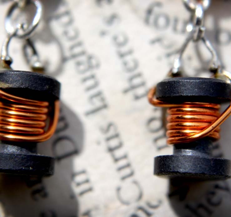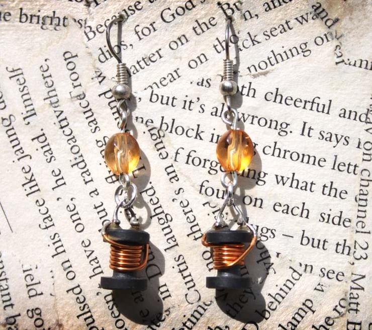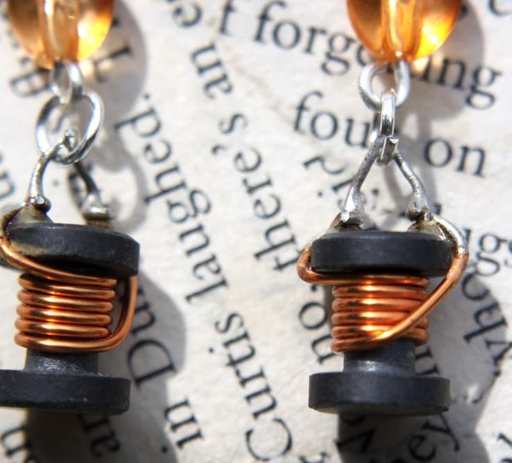 These coiled copper capacitors have been removed from old circuit boards and hand soldered to create charm findings. They hang from orange plastic beads, which in turn hang from hook earring findings.