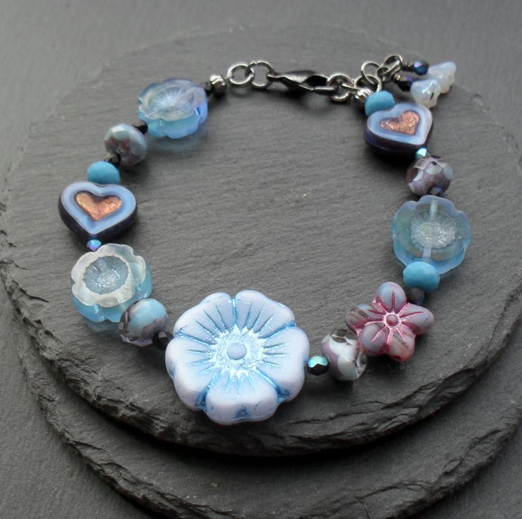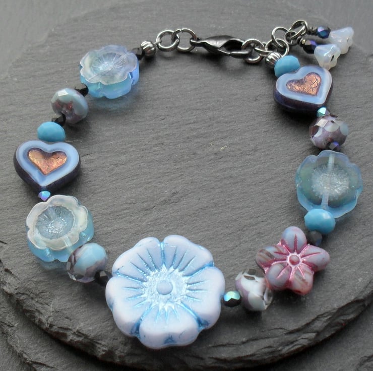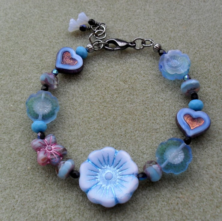 Czech glass flower beads and Czech fire polish beads which add a little sparkle are attached to a black plated lobster clasp with a small extender