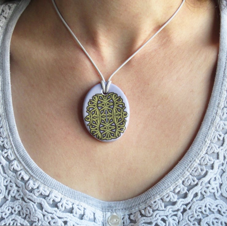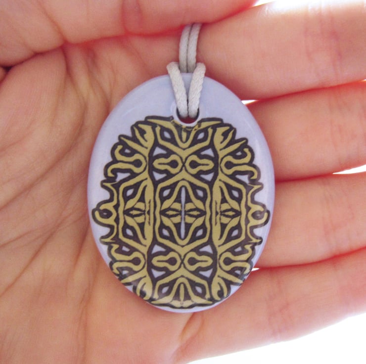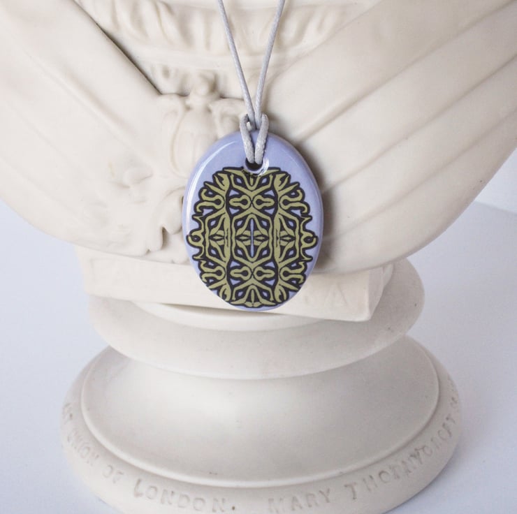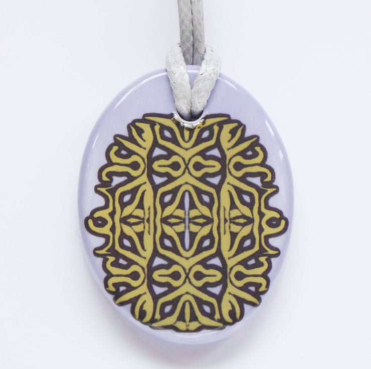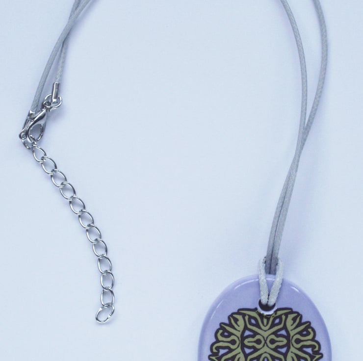 Mauve and Gold Colour Rococo Pattern Oval Ceramic Pendant on 38 - 43cm or 15 - 17 inch Light Grey Cord with Lobster Clasp