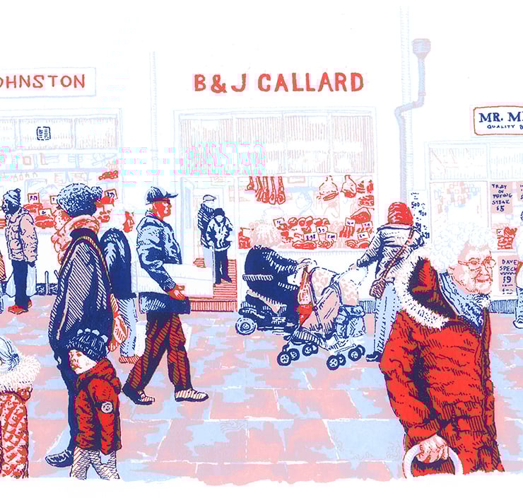 This greeting card is of Butcher's Row. It's of a lively section of Leeds market where all the butchers were grouped together and you had them all displaying their goods and shouting their meaty deals at you as you walked passed. They've moved them elsewhere in the market now, but this is how I liked it best. The original image was a screenprinted artwork by myself, Leeds based illustrator Simon Lewis, in early 2014. It’s a 4 colour screenprint, each colour derived from a detailed drawing to give a bright and vibrant overall image.