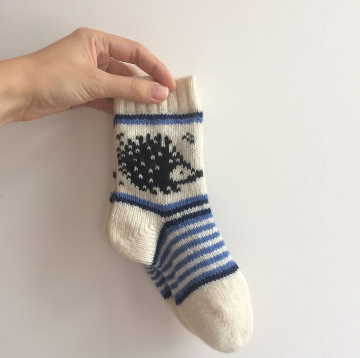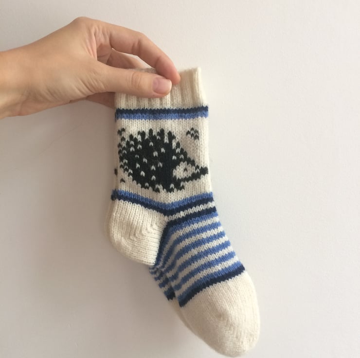 READY TO SHIP Children Kids Socks White Wool Hedgehog Blue White Fair Isle
