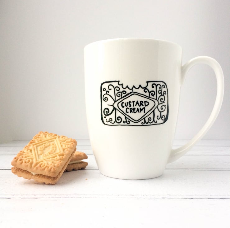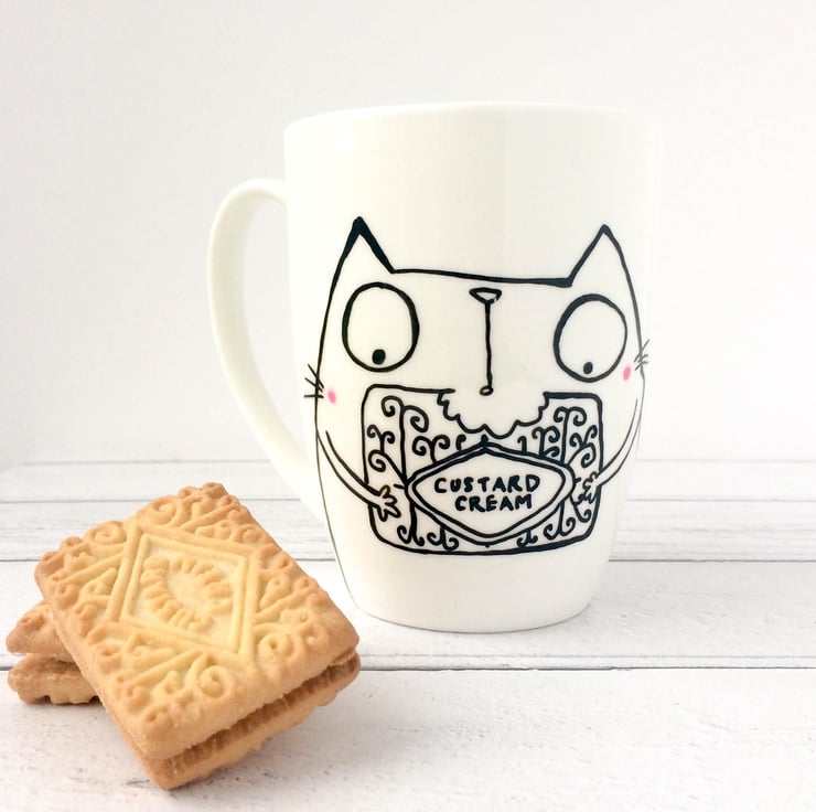 Custard Cream kitty illustration hand painted using porcelain paints onto fine bone china mug.