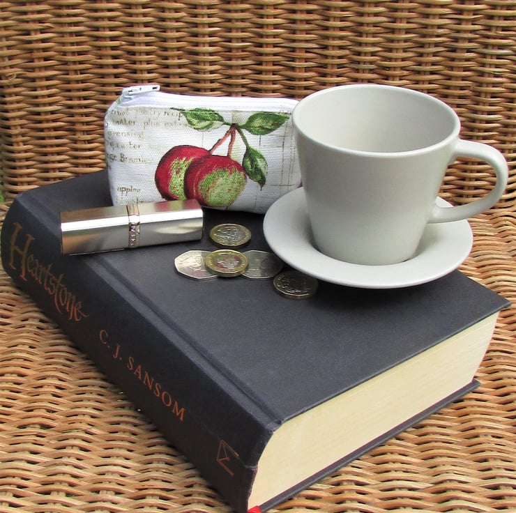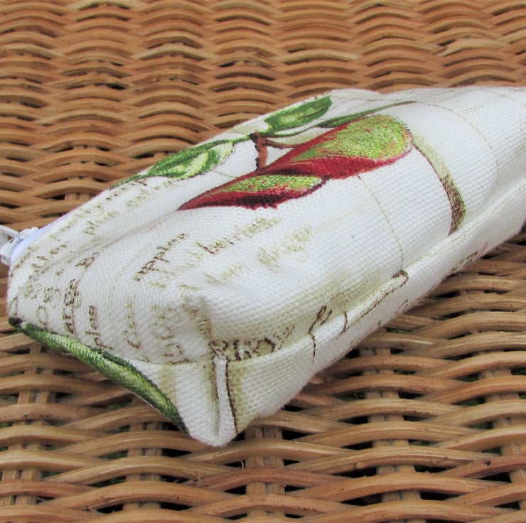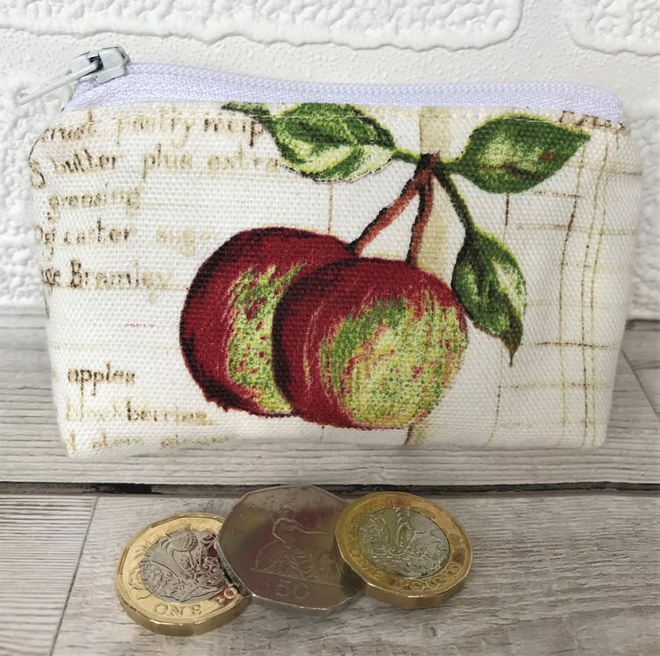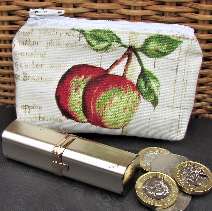 A small coin purse with a rustic print pattern featuring two red and green apples and green leaves. The background is pale cream with a printed recipe in beige script. The coin purse has a pale cream zip and is lined with cream fabric. The base of the purse is boxed to give a spacious interior.