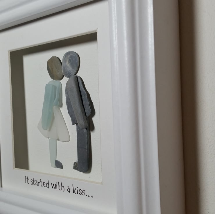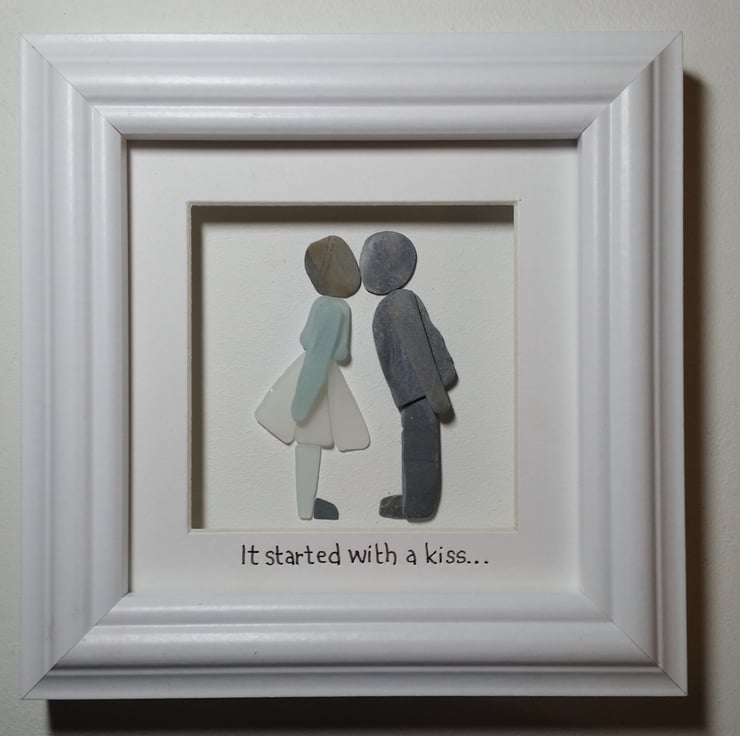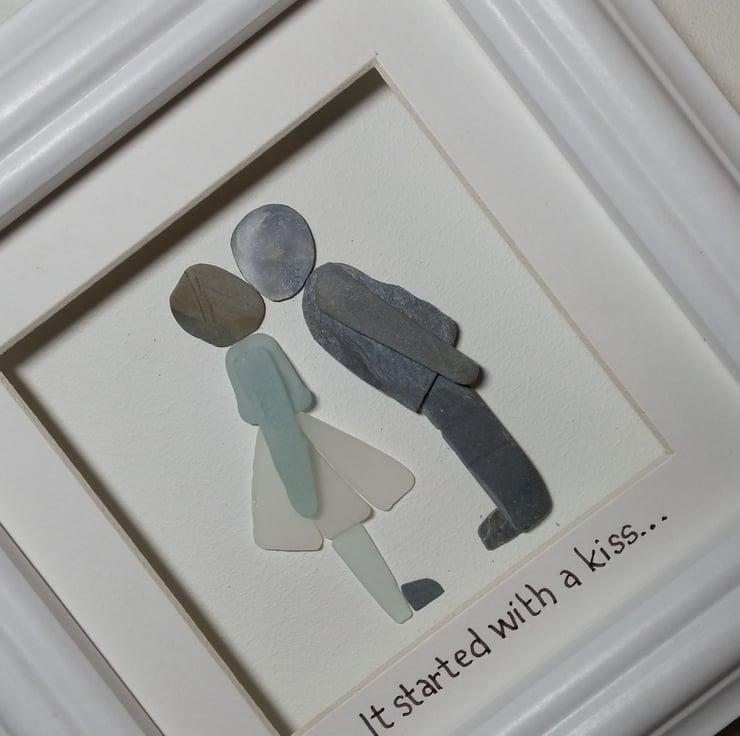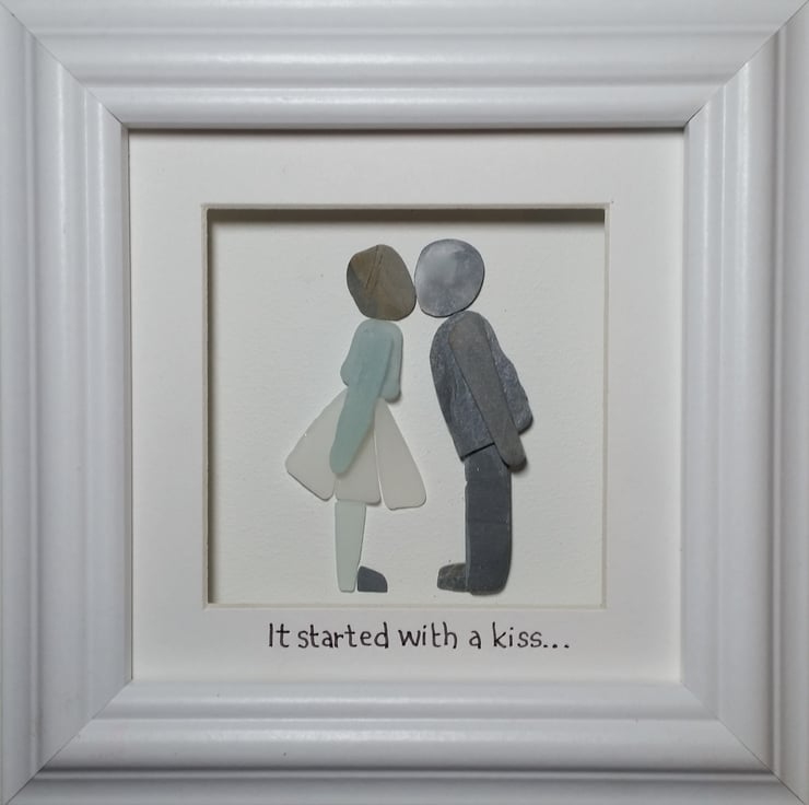 A little sea glass and stone couple lean in for a kiss including the inscription 'It Started with a Kiss'.