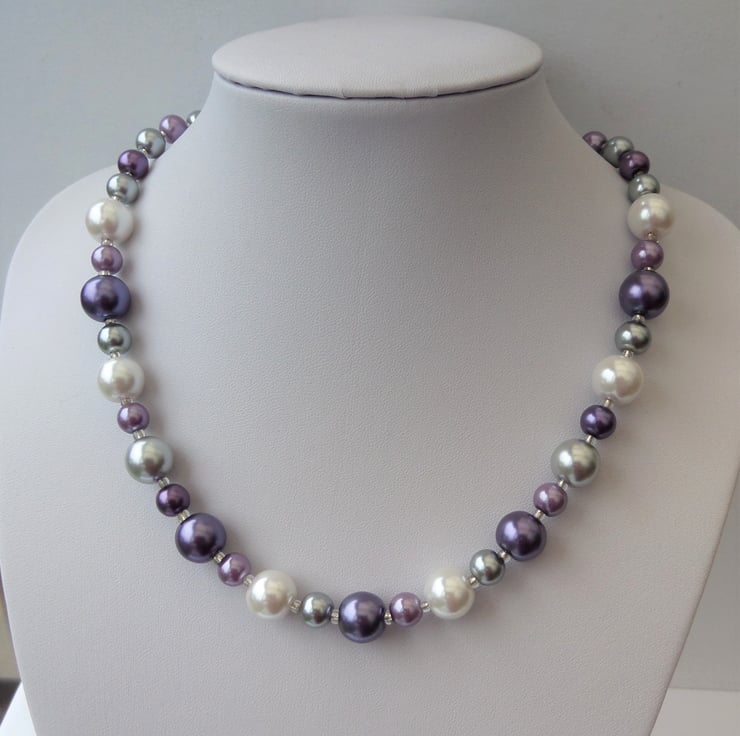 Necklace made using 12mm white, silver grey and purple glass pearls and 8mm white, silver grey and two shades of purple glass pearl beads and sillver lined clear seed beads.