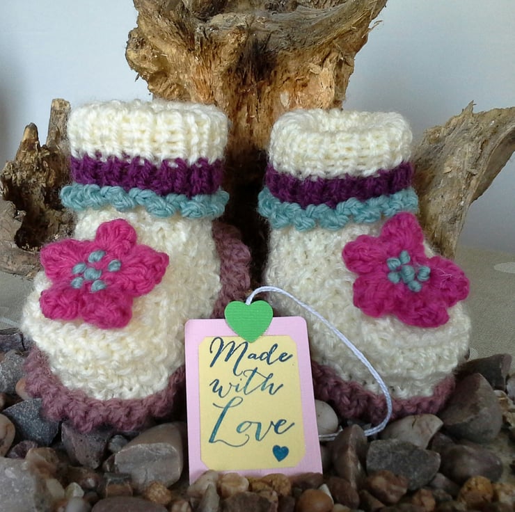 A lovely practical pair of booties designed and hand crafted by myself using genuine 'JAEGER' branded pure new wool. They would make a perfect gift for a baby girl who's parents spent time pursuing outdoor activities with their young children. These booties will keep those delicate toes and feet cosy and warm whilst outside during cold winter days. All yarns are guaranteed machine washable by the yarn manufacturers.