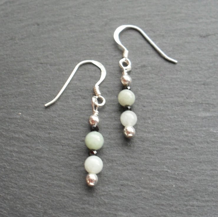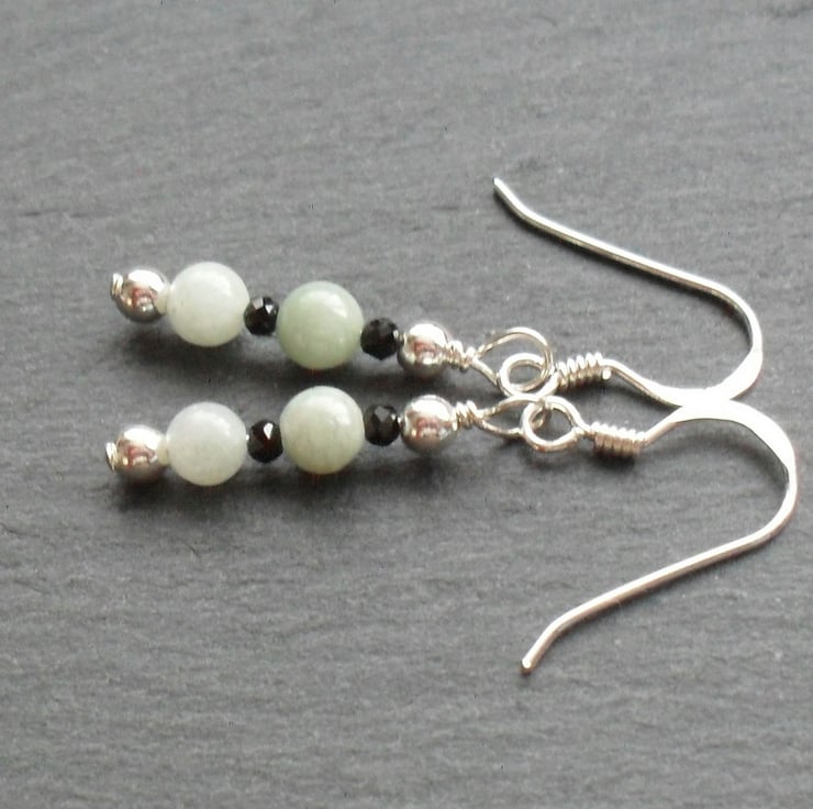 These lovely dainty earrings are made using Genuine Burmese jadeite gemstones with faceted small black spinel and sterling silver