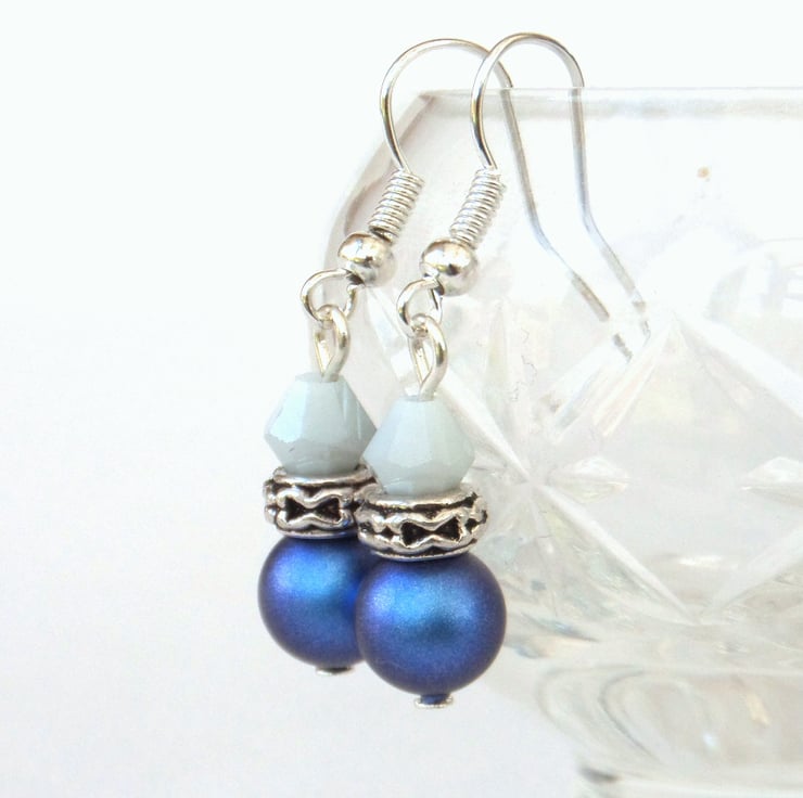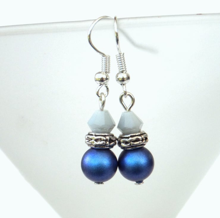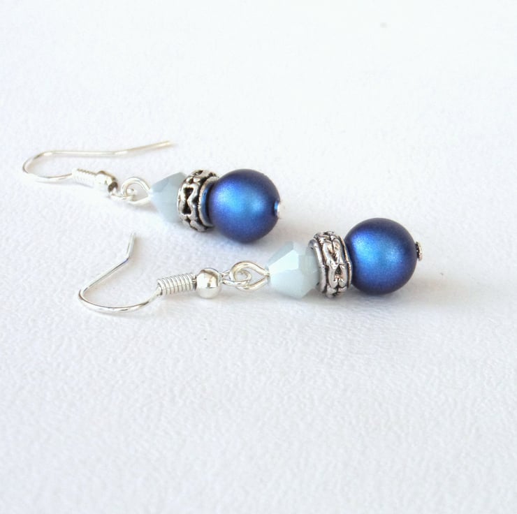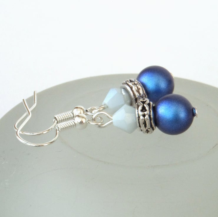 A lovely pair of earrings, contrasting 8 mm deep blue Swarovski® crystal pearls with lighter blue crystal bicones. The earrings hang from silver plated earwires.