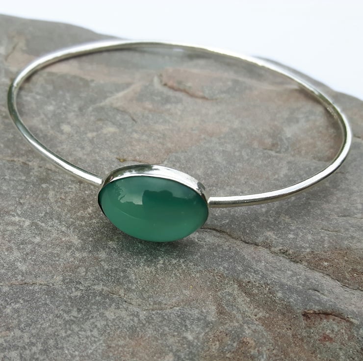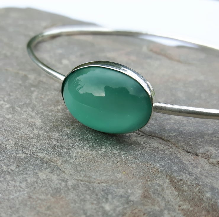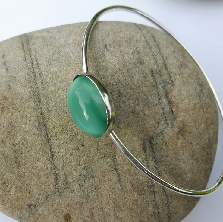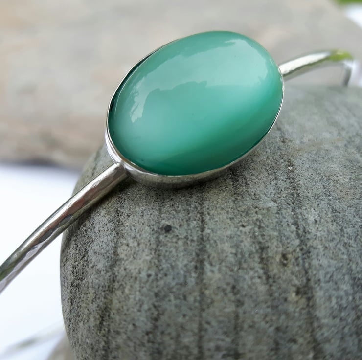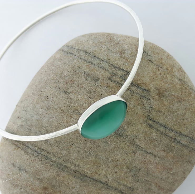 This gorgeous sterling silver bangle is made from 2mm round wire which has been textured by lightly hammering the surface. It features a beautiful turquoise cat's eye cabochon, 18x13mm, which is made from a high quality fibre optic glass that reflects a bright band of light, shifting as you change your angle of view. It is set in a sterling silver bezel cup. Traditional silver hallmarks have been applied to the inside of the bangle by the London Assay Office, including my own maker's mark. I have made it slightly oval in shape so that it sits snugly on the wrist. The size is medium with a circumference of 20.5cm. This bangle will be packaged in a smart gift box or organza bag and sent by Royal Mail signed for delivery service in the UK or by guaranteed delivery to other countries.