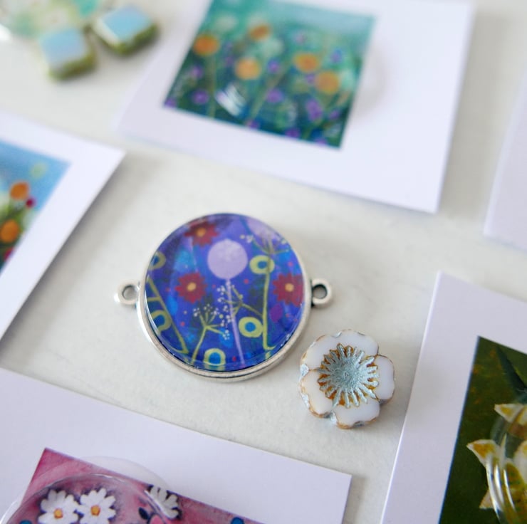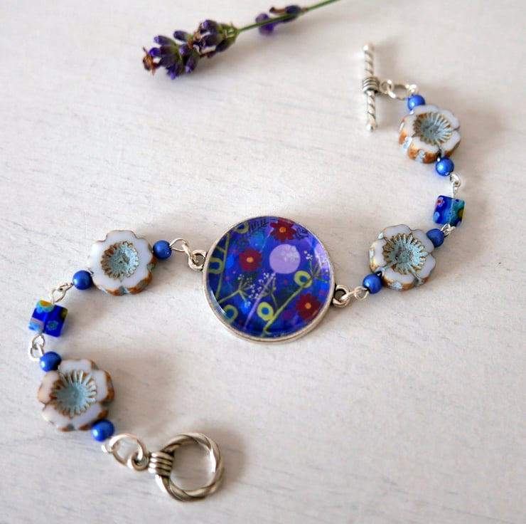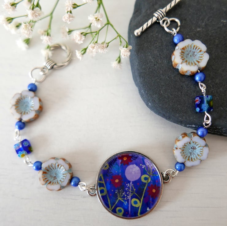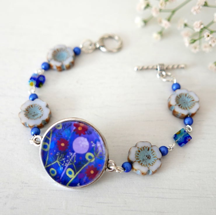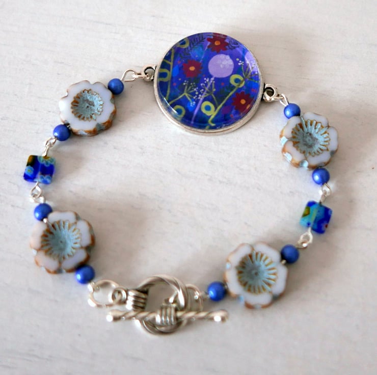 I made this midnight blue bracelet using a pendant connector featuring an image after one of my floral paintings. The print is glued onto the silver setting and sealed under a glass cabochon. I also used pale purple-blue Czech glass beads, blue glass beads, and blue millefiori square beads, The floral bracelet measures approx 7.75" (20cm) and it finishes with a toggle clasp.