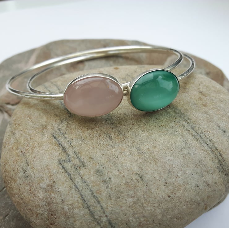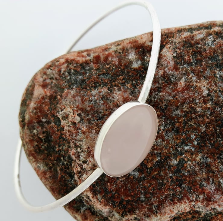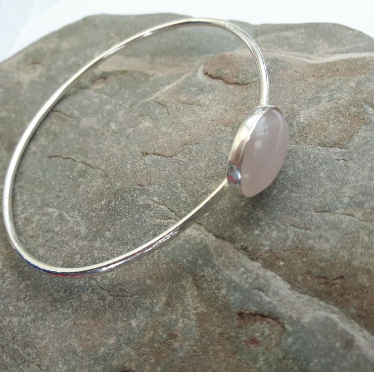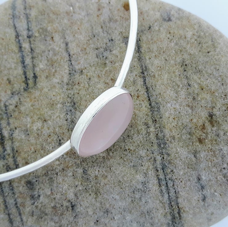 This pretty sterling silver bangle features a lovely oval cabochon of pale pink rose quartz. It would make a great gift for a girly girl who loves feminine things! The stone measures 18x13mm and is set in a sterling silver bezel cup. The bangle has been made from 2mm round silver wire, lightly hammered to add a sparkling texture and formed into an oval shape so that the stone sits neatly on the wrist. The size is medium, with a circumference of 20.5cm. Traditional silver hallmarks including my own maker's mark have been applied by the London Assay Office. This style is available with different stones, and there are also matching earrings for sale in my shop - see last photo. The bangle will be packaged in a smart gift box or organza bag and sent to you by Royal Mail signed for delivery in the 7 or by fully tracked and guaranteed delivery to other countries.