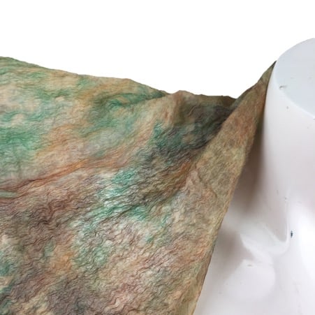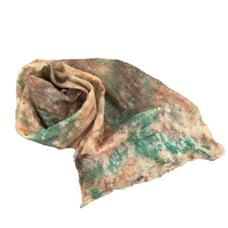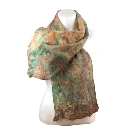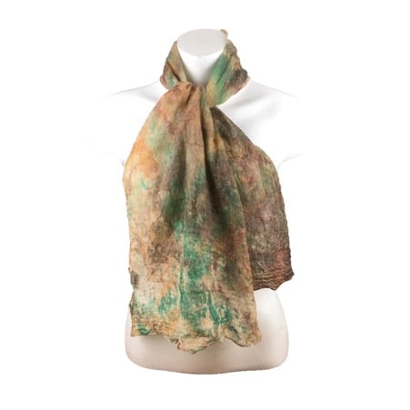 Natural (undyed) white merino wool fibres have been laid in fine layers over a hand dyed silk chiffon scarf in autumnal shades of brown, green and orange and nuno felted. This process causes the wool fibres to migrate through the silk and bind with it resulting in a beautifully soft and warm yet lightweight scarf. The reverse of the scarf is white wool fibres.