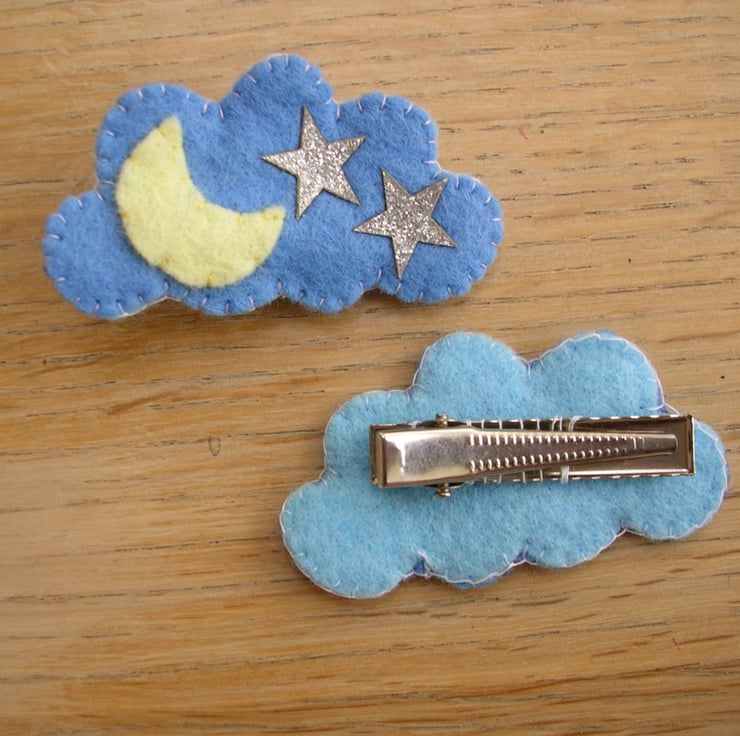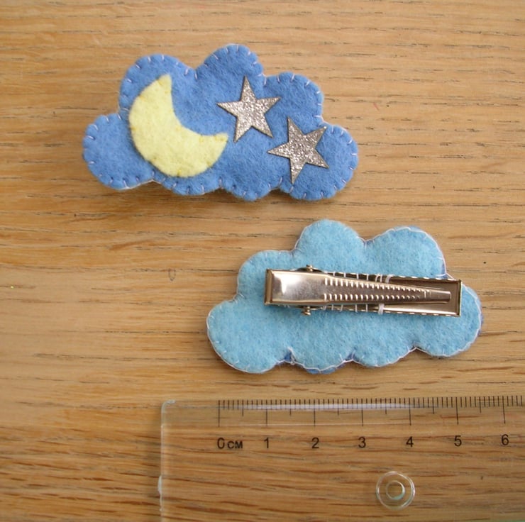 These stunning might sky hairclips are made from soft blue felt with silver sparkling stars and a yellow crescent moon. They measure 5cm by 2.5cm and are mounted onto 4cm alligator clips. Sturdy and durable, they won't slip even on thin hair.