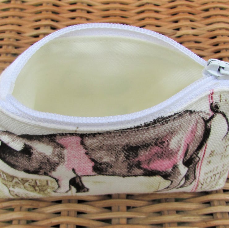 A small coin purse with a rustic farmyard print pattern featuring a pink and black pig. The background is pale cream with a printed recipe in beige script. The coin purse has a pale cream zip and is lined with cream fabric. The base of the purse is boxed to give a spacious interior.
