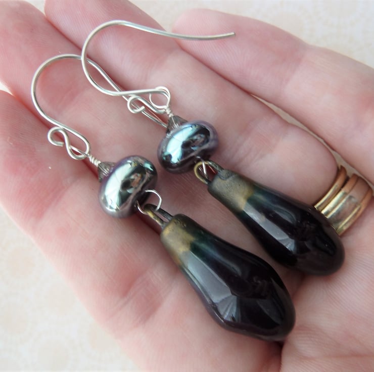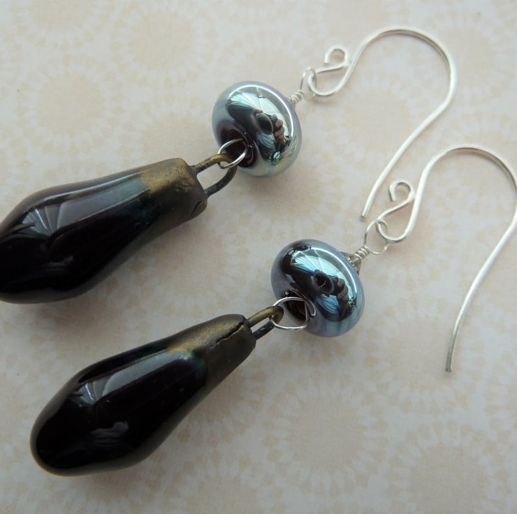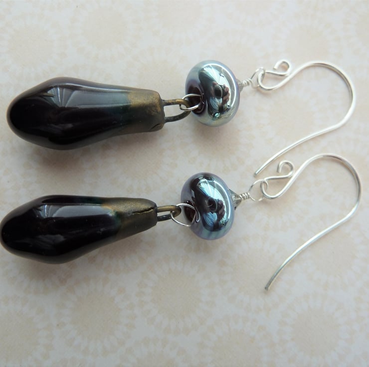 A pair earrings made with handmade sterling silver ear wires, swarovski crystals, handmade lampwork glass beads and handmade ceramic drops.