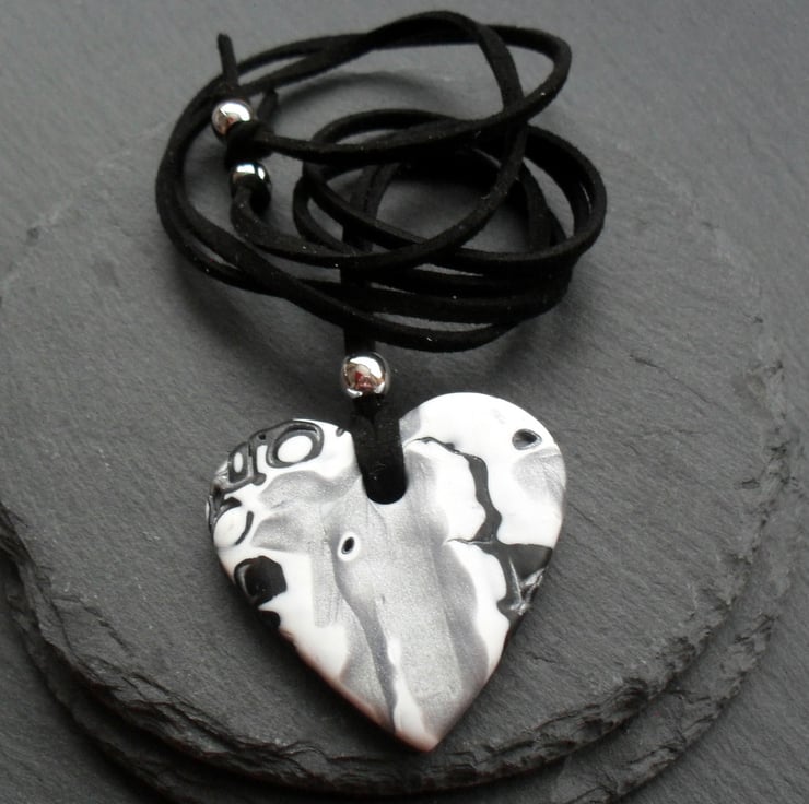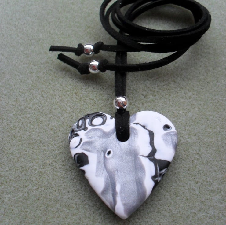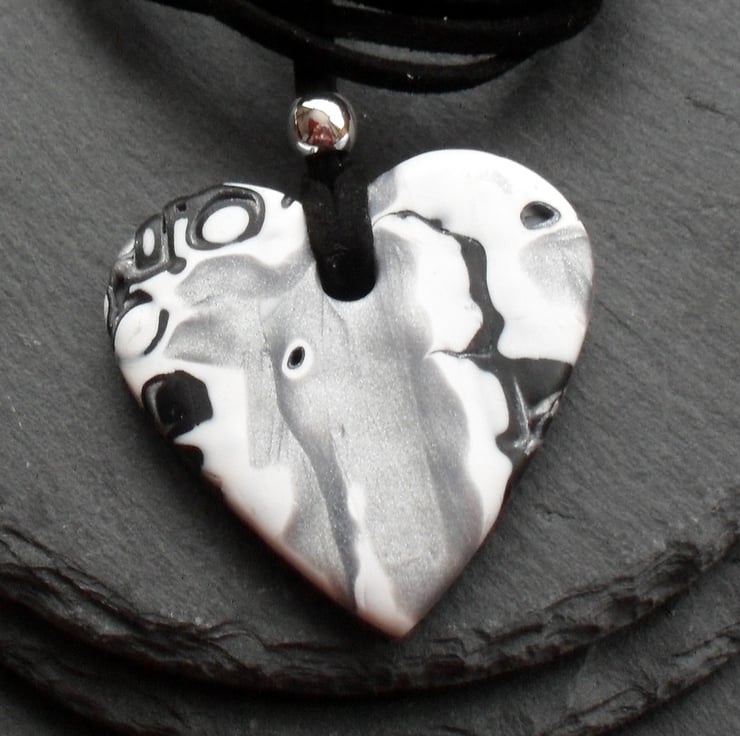 Silver,black and white polymer clay heart pendant which has a lovely pattern made with the mokume gane method of layering the clay the pendant has a couple tiny holes on the top layer of the clay this is part of the design.