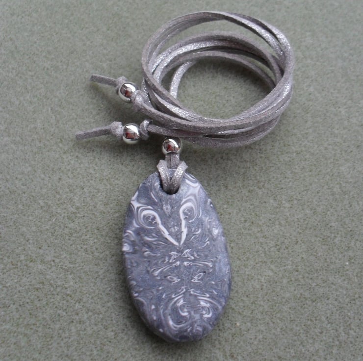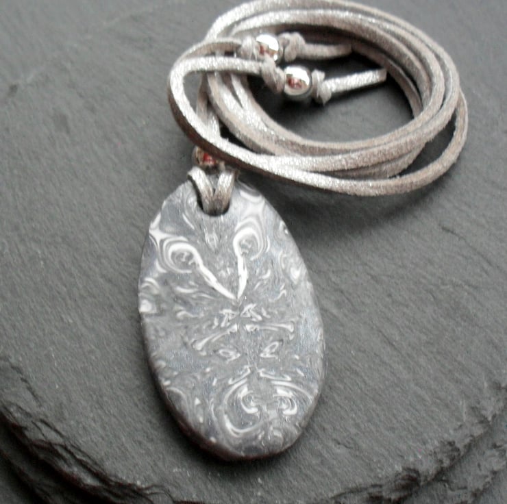 Silver,grey and white polymer clay pendant which has a lovely pattern has been attached to a silver faux suede cord which is plain on one side and has a silver glitter effect on the other.