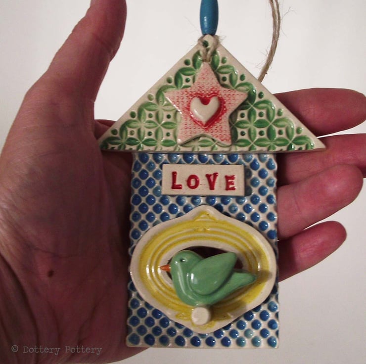 This little house decoration is made from white earthenware clay and finished in a variety of patterns and colours.
