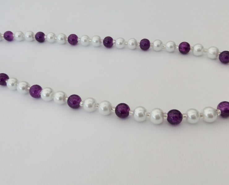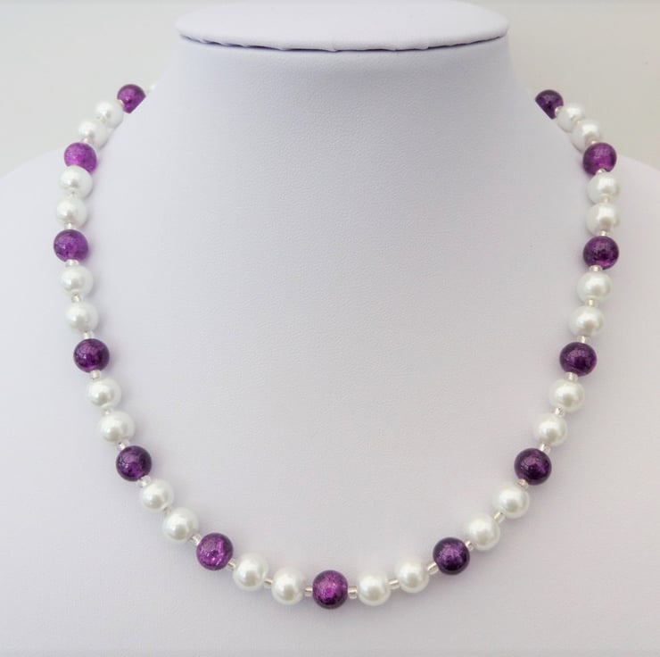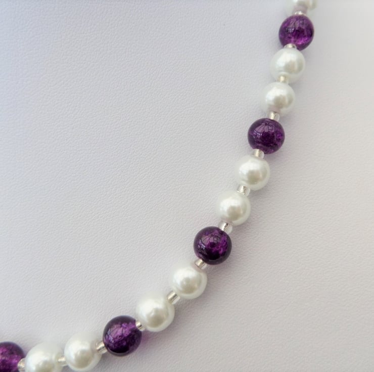Necklace made with 8mm white pearls and 8mm dark purple crackle beads and silver lined seed beads.