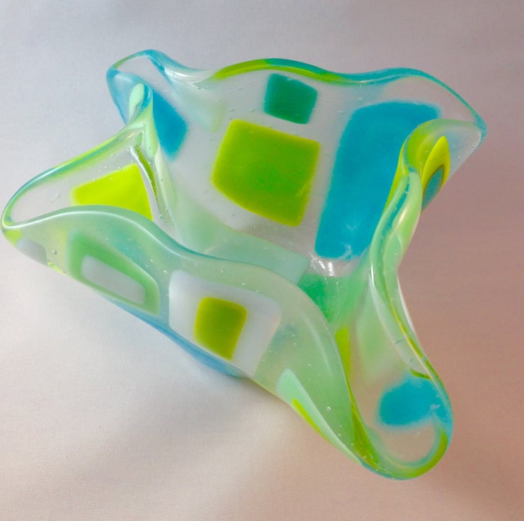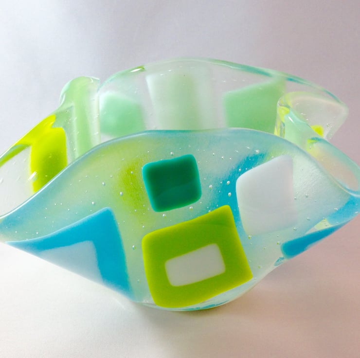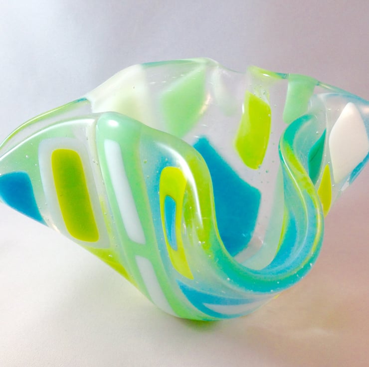 This unique fused glass bowl is made on a base of clear glass with a vibrant pattern of blue, green and white shapes fused on top. Fused to 800 degrees Celsius and then slowly cooled over 12 hours with an annealing process added to strengthen the glass. It then had a further firing to 720 degrees Celsius to shape it into its final organic form, spending a total of 24 hours in the kiln. Because of its shape it is hard to give precise measurements but it stands approximately 90mm tall, and is 170mm at its widest point.