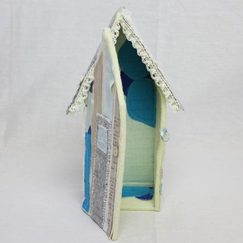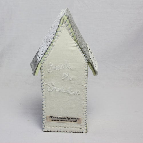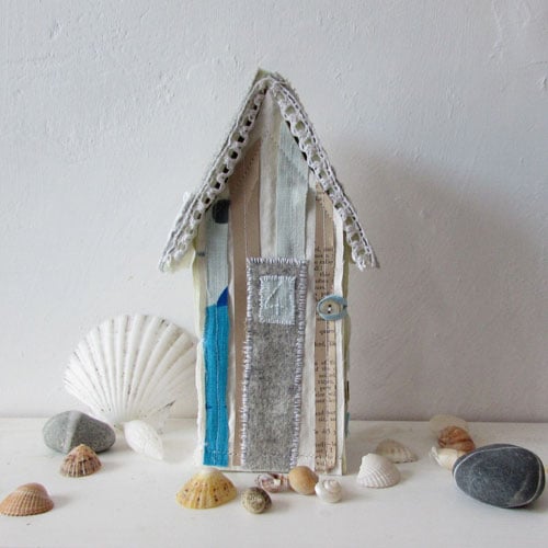 This soft sculpture beach hut is made from thick woollen felt covered with vintage fabrics, antique book papers, cotton doilies and lace trims. It has hand embroidered text on the back that reads “Beside the Seaside”. I hand make a range of beach huts and each one is a unique one off piece.