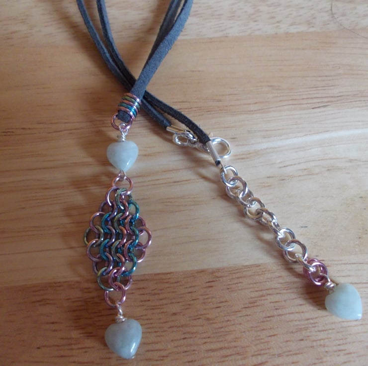 This pendant features two jadeite hearts at either end at a chainmaille diamond.
