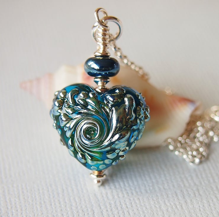 This beautiful glass heart is a deep turquoise blue with a surface swirling design in reflective silvered glass. The design is on both sides of the heart. I have added a smaller lampwork silvered glass bead and completed the pendant using sterling silver beads.