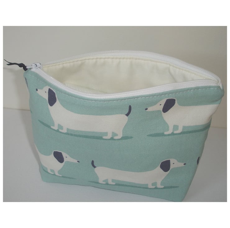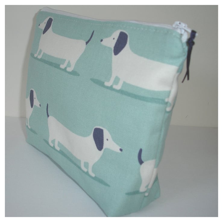 A Padded Flat-bottomed Large Purse ideal for holding toiletries, underwear , make up , cosmetics - large enough to hold a hairspray can. A perfect size for keeping your loose bits and pieces together in your holiday suitcase. A modern retro design cotton fabric.