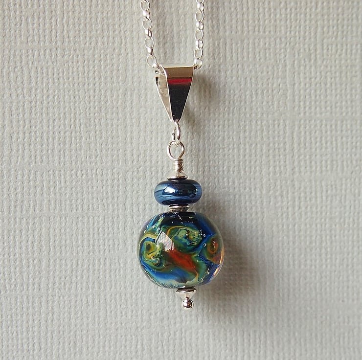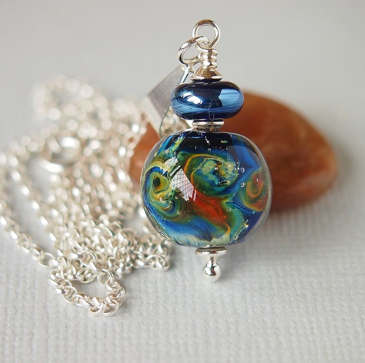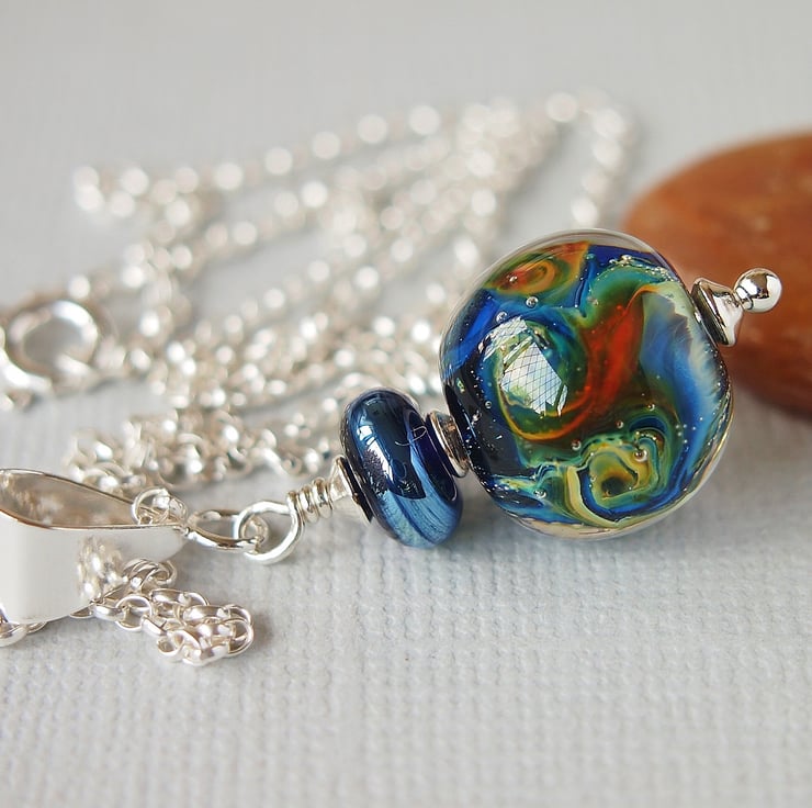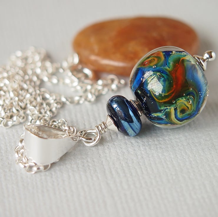 Beautiful pendant featuring a stunning lampwork bead in blue with swirling rainbow colours handmade by UK artisan. Such a gorgeous bead like a miniature galaxy.