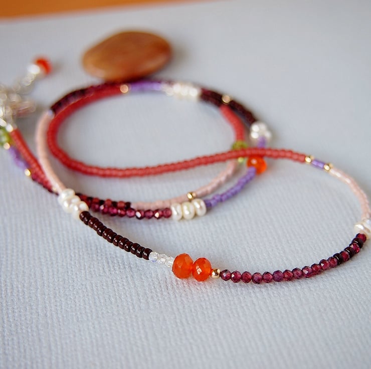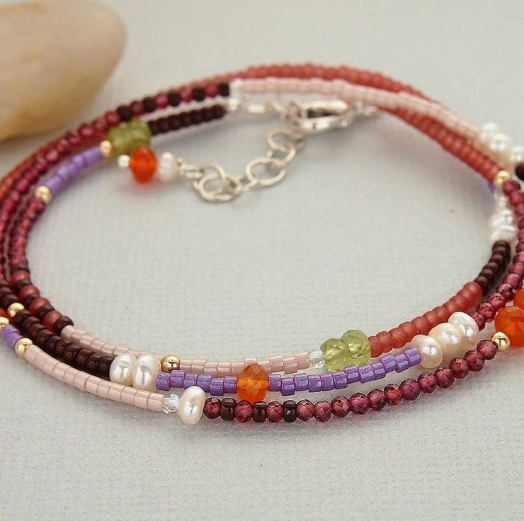 This delicate wrap style bracelet is comprised of Miyuki Glass Delica and Rocaille beads in shades of dark red, orange, green and brown interspersed with freshwater pearls, Carnelian and Peridot. Beautiful gold filled round beads, tiny Swarovski crystals and the most gorgeous 2mm faceted Garnet gemstone beads add a lovely sparkle.