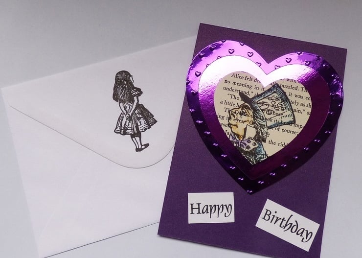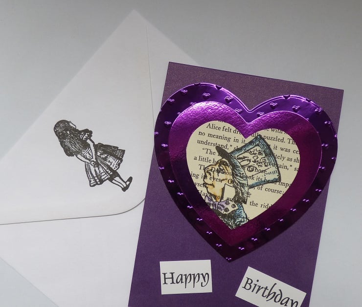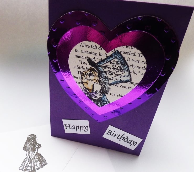 I have used a page from the book to create a stamped focal point of the Hatter in a heart, I have used watercolours to add colour to him and his outfit. he is surrounded by die cut hearts in purple foiled card which I have embossed with even more hearts. This topper has been attached to a purple easel card. I have added white card inside so the sentiment can be written in and easily seen.