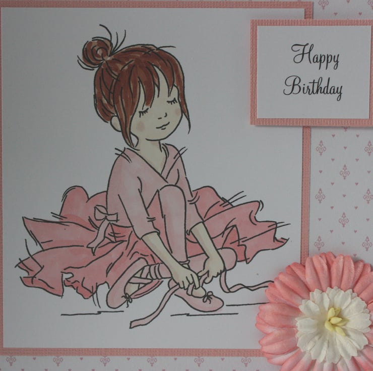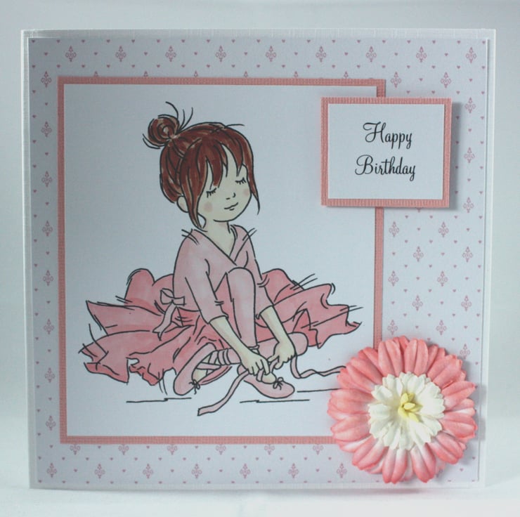 Square, handmade birthday card, featuring a hand coloured image of a ballerina. The image has been layered on pink card, over a pink and white patterned background.